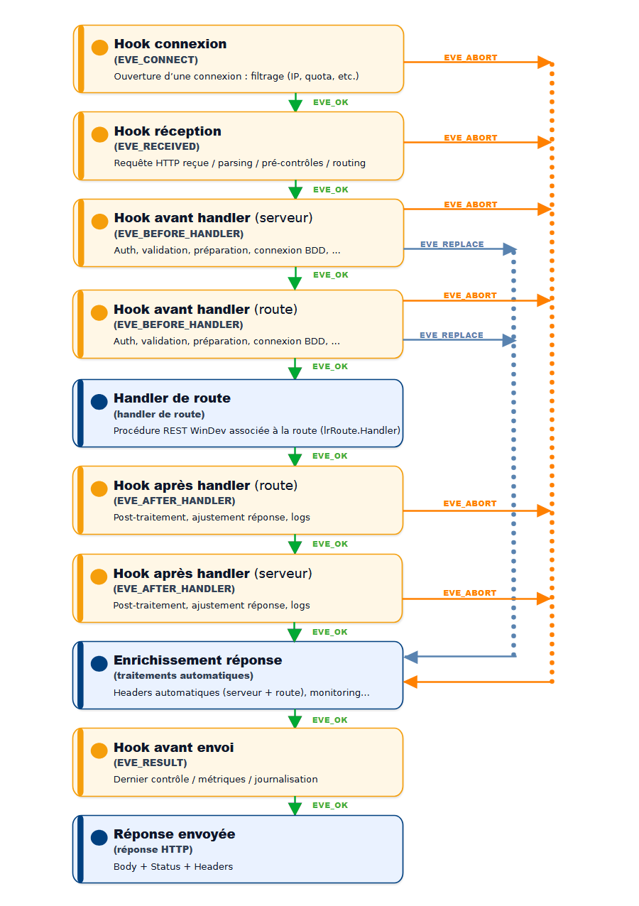 – EVE_ABORT : le traitement est interrompu. Le contenu de la réponse (headers+body) est envoyé au client (avec une probable erreur HTTP)